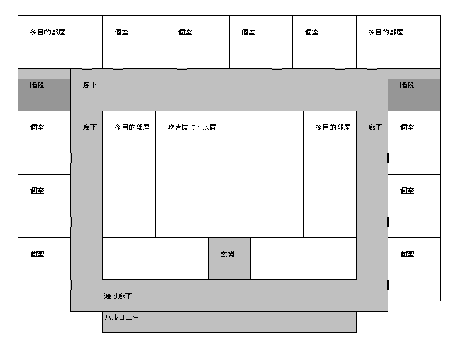 コの字型にぐるっと廊下があって、両端が渡り廊下でつながってる構造。
